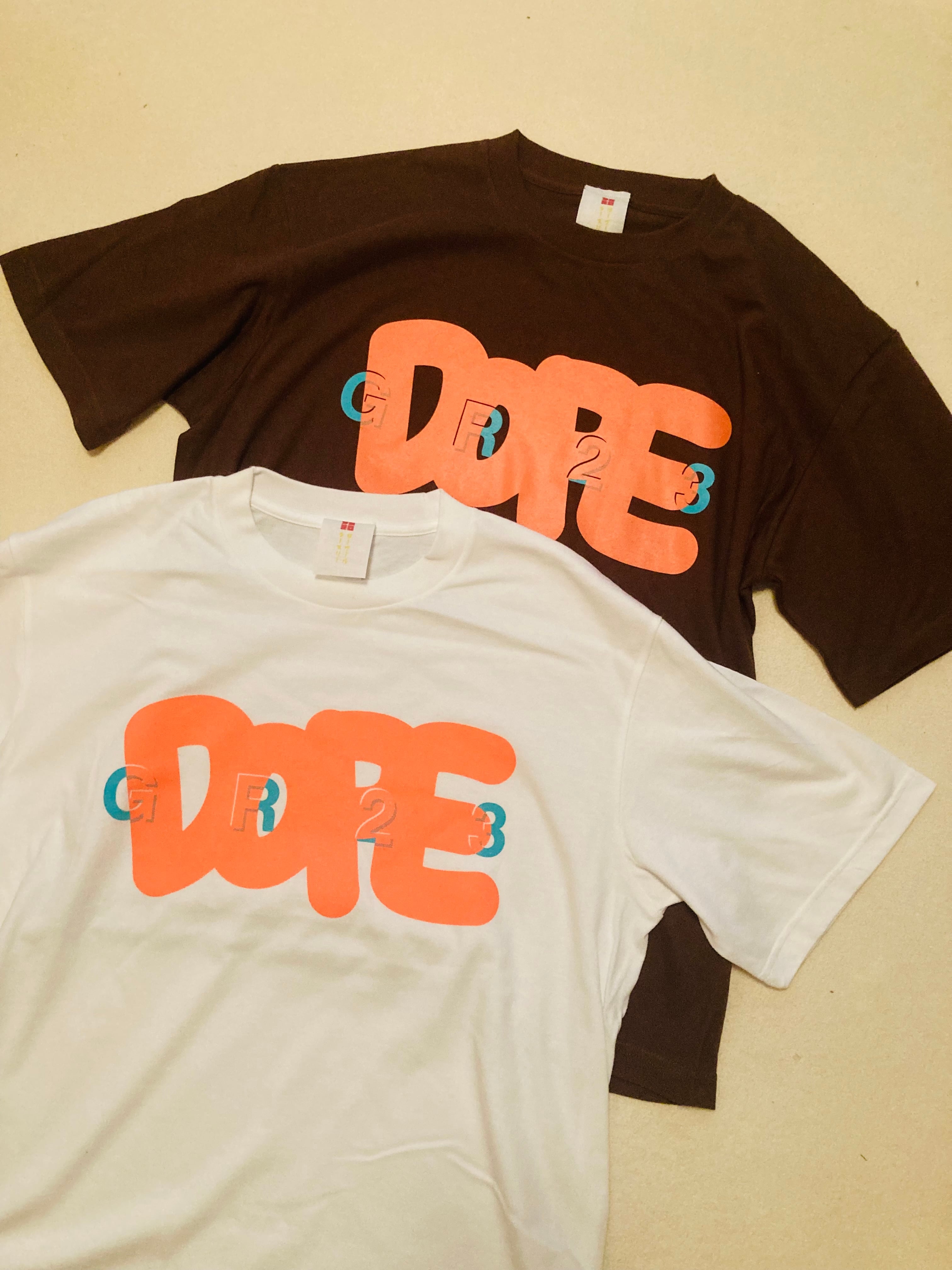 フロント中央へ大きくポップなオレンジ色の「DOPE」ロゴを配置したデザインです。