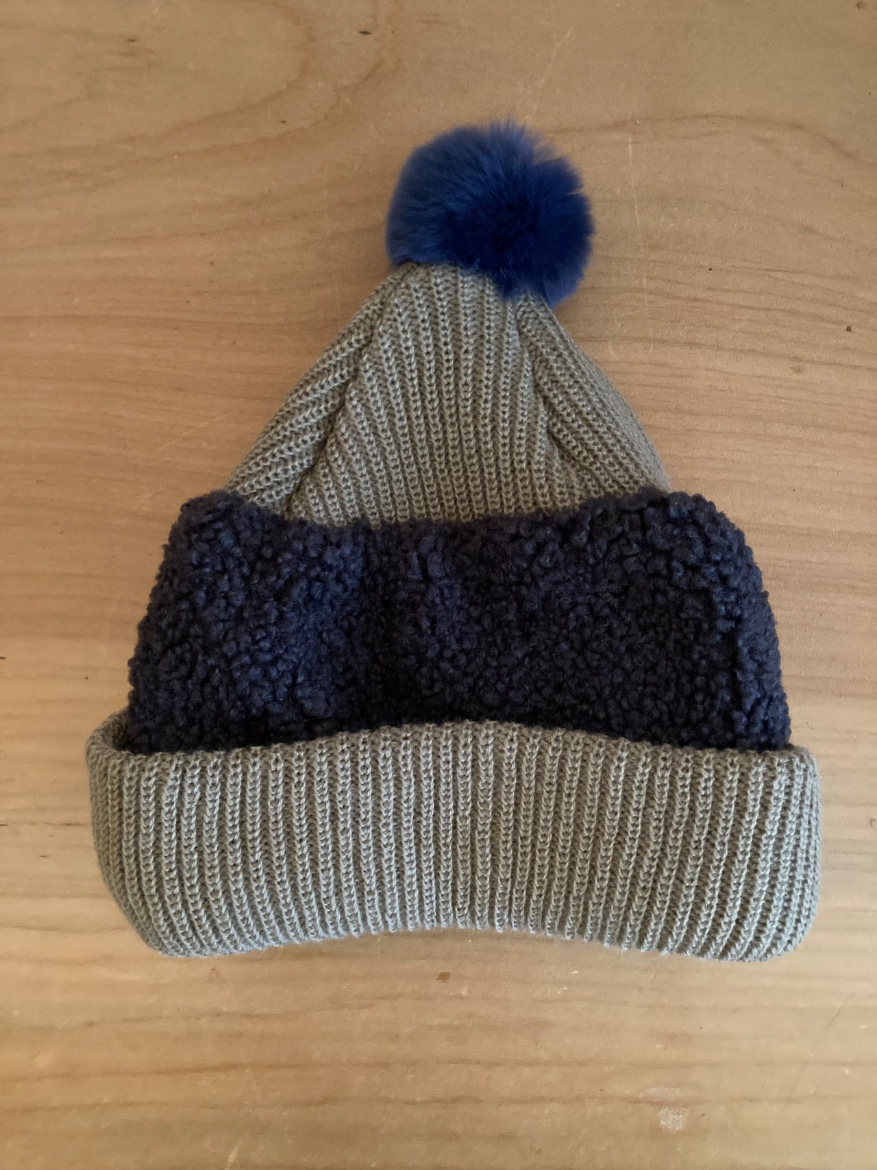 ファー素材のバイカラーのボンボンとファーがデザインされたニットビーニー